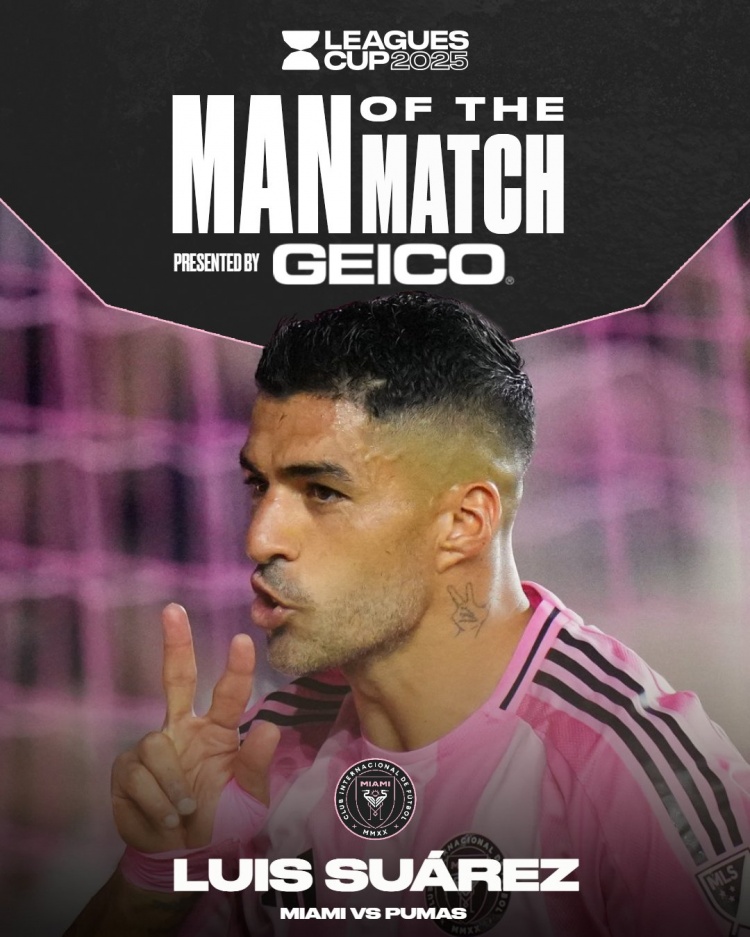 此役苏亚雷斯勺子点射破门,并送出2记助攻,帮助迈阿密国际取胜,他当选本场比赛最佳球员。