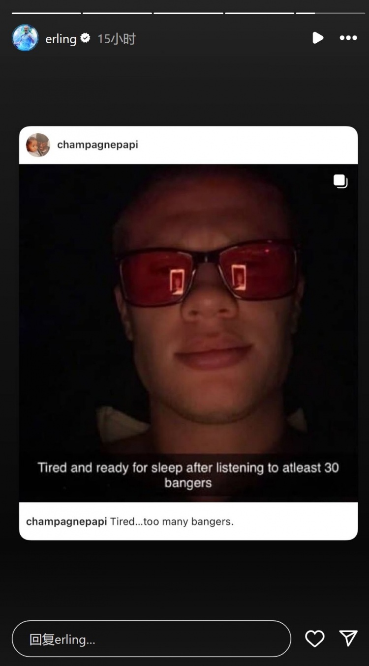 德雷克社媒晒出多张演唱会照片,其中包括哈兰德的这条动态截图,配文回应:“累了,太多劲歌热曲了。”哈兰德也转发了德雷克的动态。