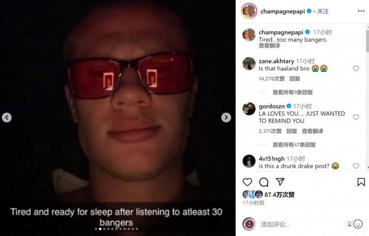 哈兰德现身加拿大说唱歌手德雷克的演唱会现场,他在社交媒体上晒出照片并配文:“听了至少30首劲歌热曲,累了准备睡觉。”