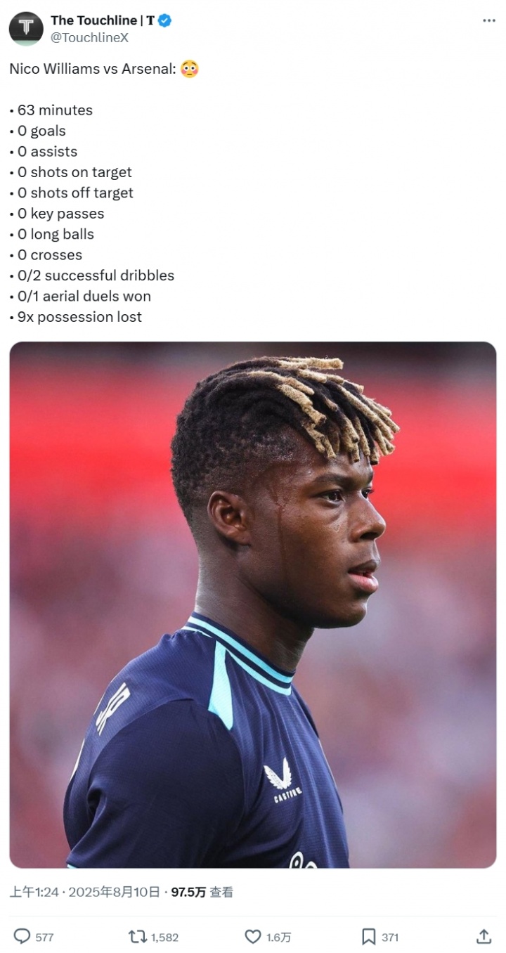 08月10日讯 毕尔巴鄂竞技在酋长杯中0-3负于阿森纳,身价7000万欧的尼科-威廉姆斯表现平庸,再度引发球迷热议。