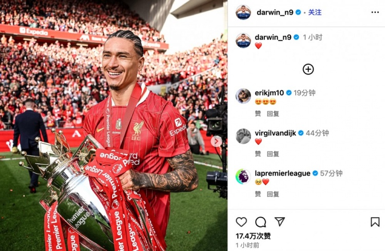努涅斯在INS上晒出了自己上赛季手捧英超冠军的图片,写道:“感谢利物浦,3年之后是告别的时候了,那些记忆都是难以忘怀的,将永存在我的脑海中。”