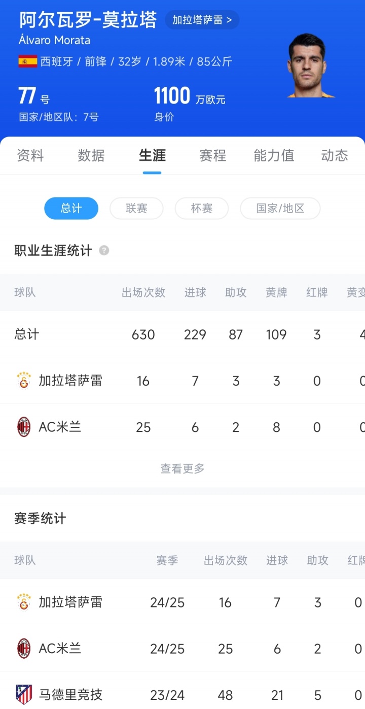 32岁的西班牙前锋莫拉塔,上赛季被AC米兰租借到加拉塔萨雷,共代表加拉塔萨雷出场16次,贡献7粒进球和3次助攻。目前莫拉塔的德转身价为1100万欧。