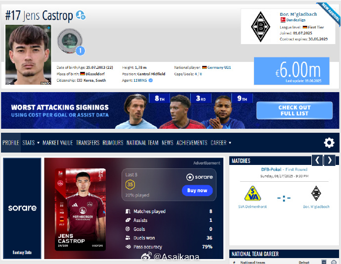 卡斯特罗普今年22岁,司职中场,曾入选过德国多个年龄段的青少年代表队。他的父亲是德国人,母亲是来自韩国的移民,球员从小在德国出生,并在杜塞尔多夫、科隆参加青训。今夏刚刚从纽伦堡加盟门兴,目前德转身价600万欧元。