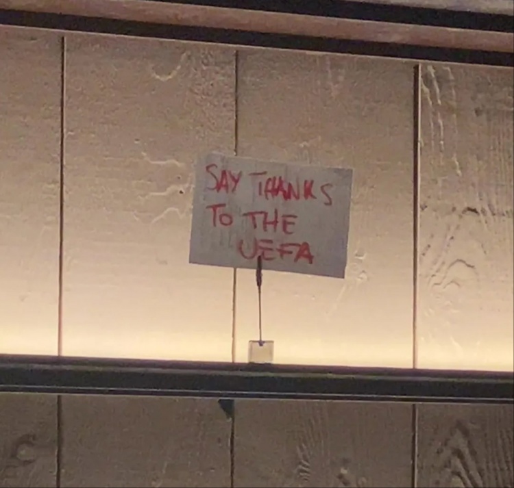 在原本放置烈酒的架子处,贴着一张纸条,解释了为什么只能卖啤酒。纸条用鲜红色的字写着:“感谢欧足联”,下面还贴着另一张写着“这不是我们的错”。