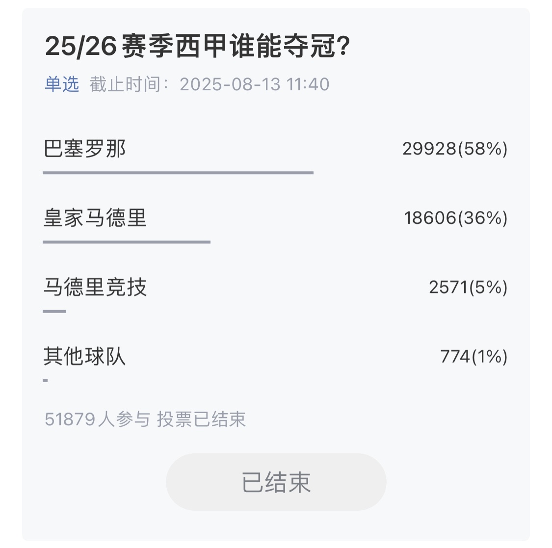 新赛季五大联赛已经拉开帷幕,【五大联赛冠军预测】吧友投票结果揭晓——利物浦、巴萨、国米、拜仁、巴黎成为得票率最高的队伍。