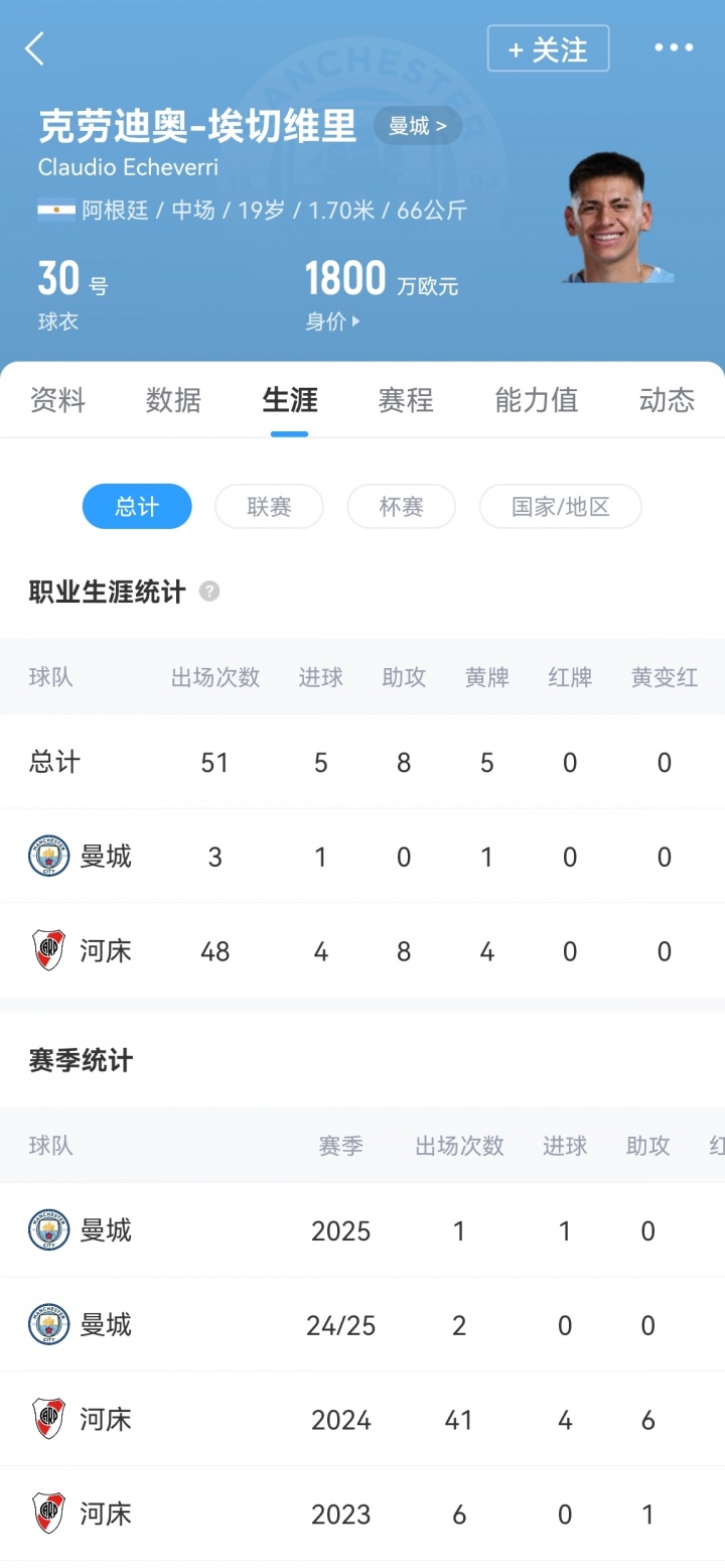 19岁的埃切维里冬窗正式加入曼城阵容,目前仅为曼城出场过3次,贡献1粒进球,现身价1800万欧。