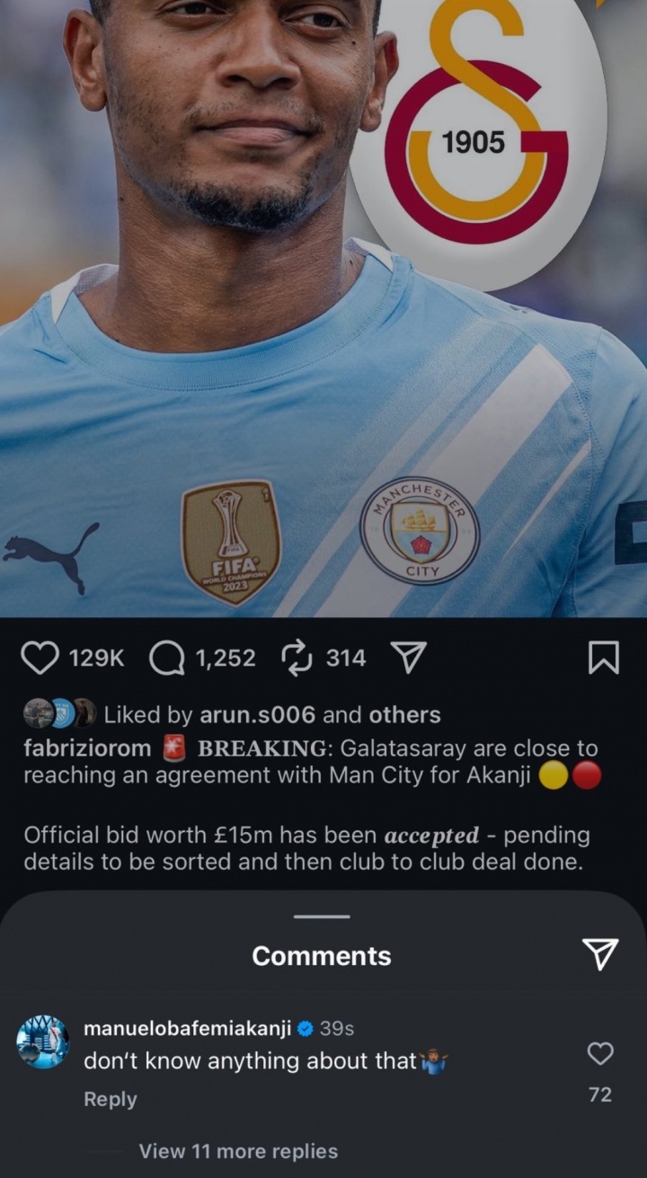 遭本人打脸!阿坎吉在罗马诺报自己的帖子下回复:我咋啥都不知道