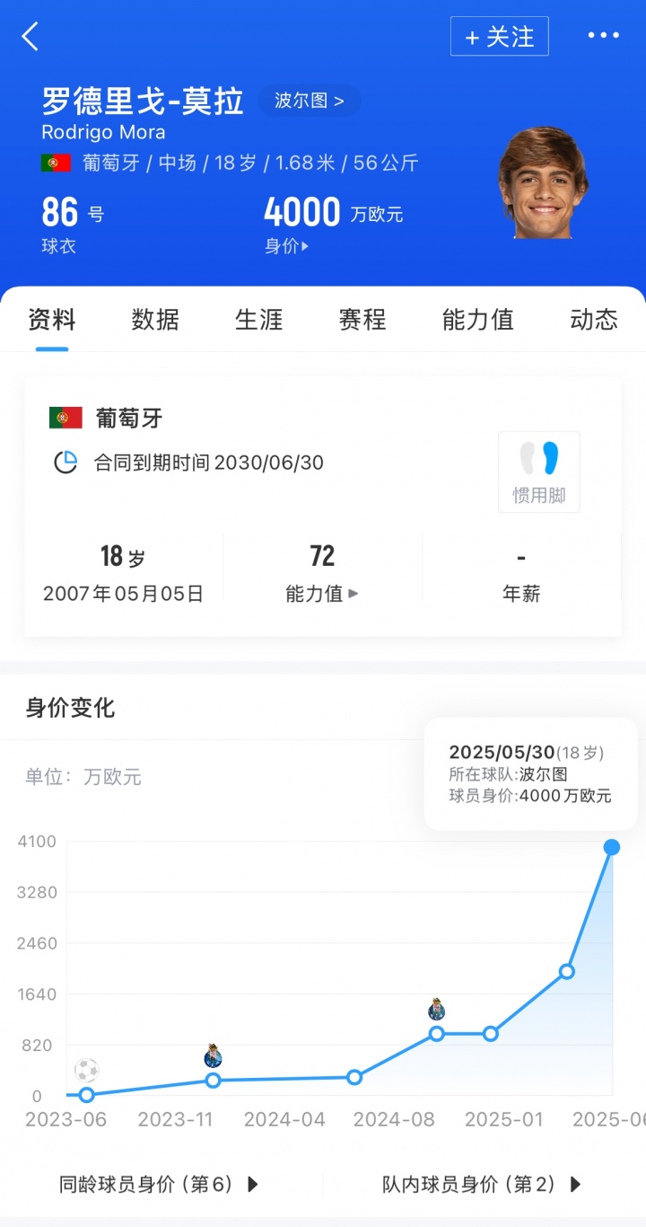 莫拉现年18岁司职中场,去年升入波尔图一线队。目前代表球队出场36次,打进11球并送出4次助攻。