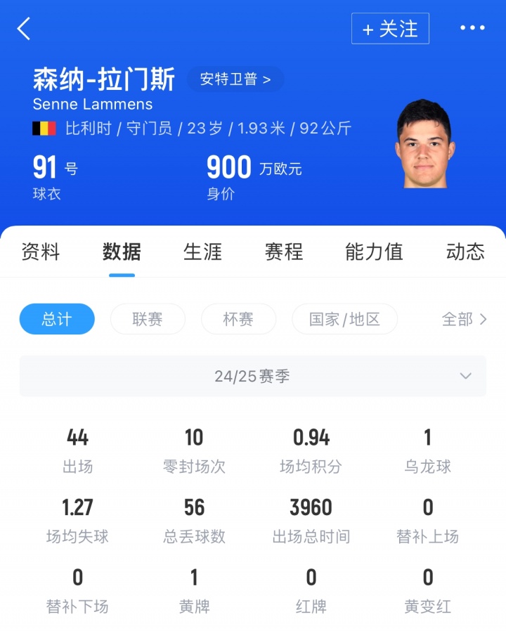 拉门斯时年23岁,比利时籍门将。上赛季他为比甲安特卫普出战44场,取得10场零封,场均失球1.27个。目前其德转身价为900万。