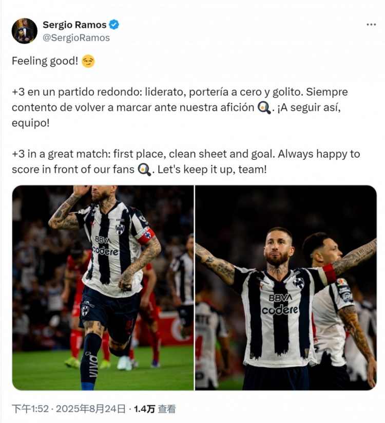 拉莫斯社媒晒出比赛照片,配文:“感觉真棒!在一场精彩的比赛中全取三分——榜首、零封和进球,在我们的球迷面前破门总是很开心,让我们继续加油!”