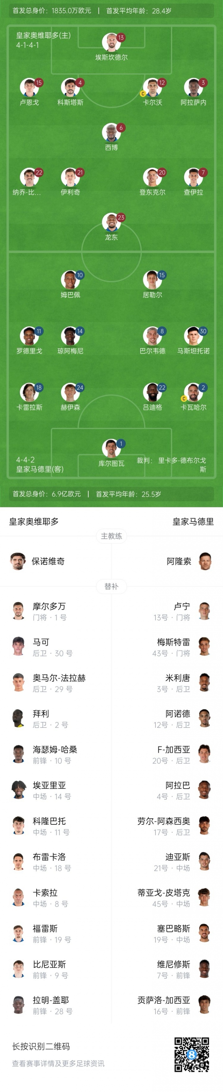 皇家马德里先发:1-库尔图瓦、2-卡瓦哈尔、22-吕迪格、24-赫伊森、18-卡雷拉斯、14-琼阿梅尼、8-巴尔韦德、15-居勒尔、30-马斯坦托诺、10-姆巴佩、11-罗德里戈