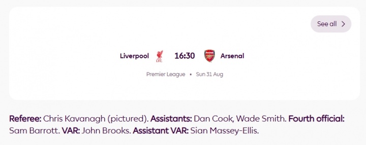 08月31日讯 英超官方宣布,今天利物浦vs阿森纳的裁判组调整,原VAR萨尔斯布里被更换为约翰-布鲁克斯。