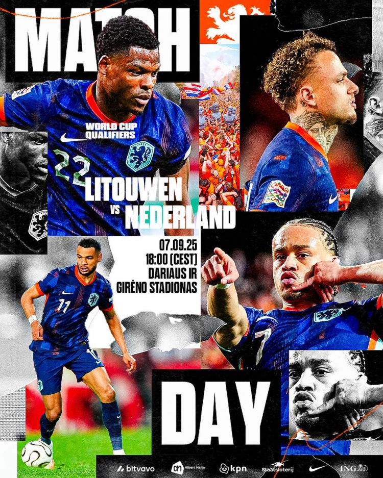 9月7日讯 北京时间9月8日凌晨0:00,世预赛欧洲区小组赛G组,荷兰队客场对阵立陶宛。赛前,荷兰队官方发布比赛海报。