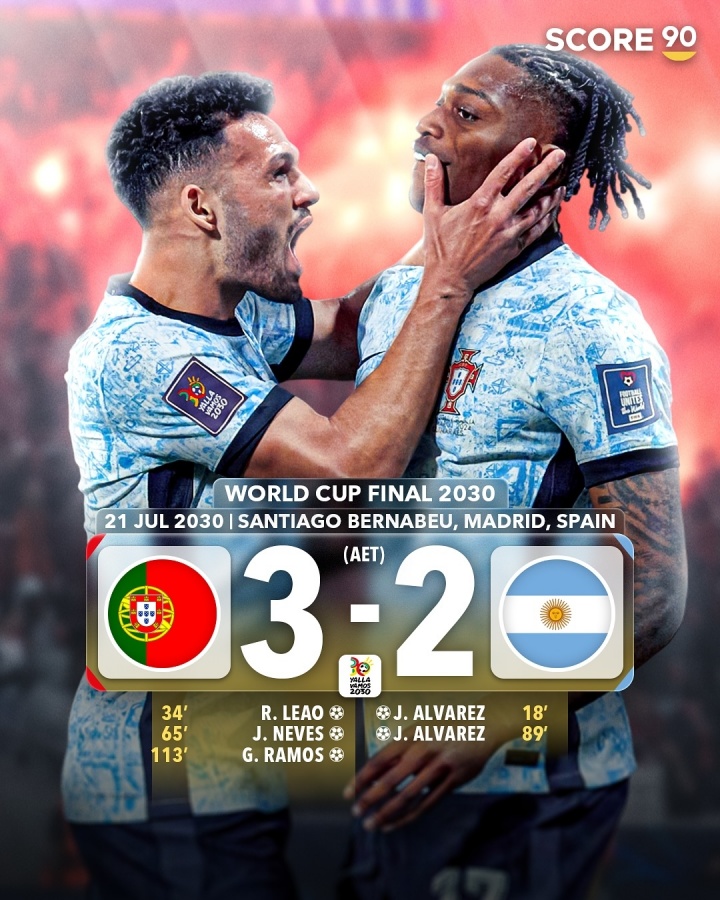 葡萄牙加时3-2逆转绝杀阿根廷,阿尔瓦雷斯首开记录,莱奥、若奥-内维斯进球反超,小蜘蛛双响扳平拖入加时,贡萨洛-拉莫斯加时绝杀。