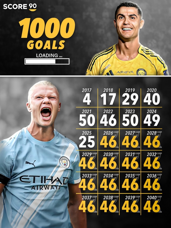 哈兰德现年25岁,到2040年他就将年满40岁,不过2025年还有半年时间,哈兰德在今年还能多多斩获进球。目前40岁的C罗职业生涯进球数为943球。