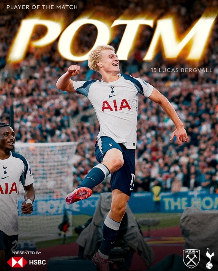 收获英超处子球,19岁贝里瓦尔当选热刺官方本轮队内最佳球员