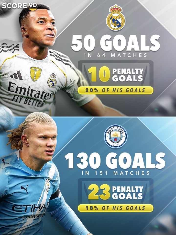 姆巴佩(皇马):64场50球,10点球,占比20%