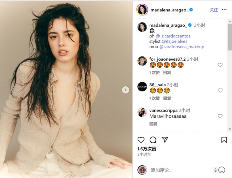 玛达莱娜社媒晒出写真,与网友分享美照。玛达莱娜现年20岁,是葡萄牙的新锐演员,她与若奥-内维斯在2024年确认恋爱关系。