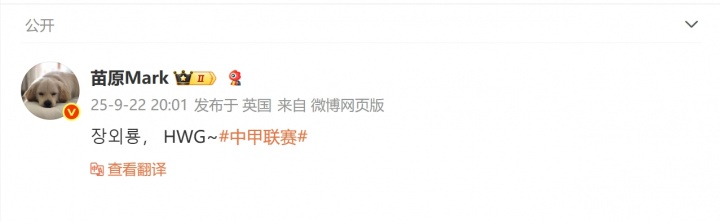 09月22日讯 媒体人苗原今日在社媒写道:장외룡, HWG~,并带上了中甲联赛标签。