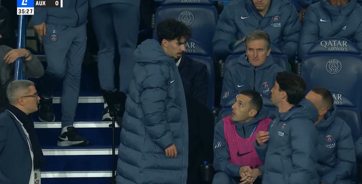 留力踢巴萨?维蒂尼亚35分钟似乎无受伤情况被换下,阿什拉夫登场