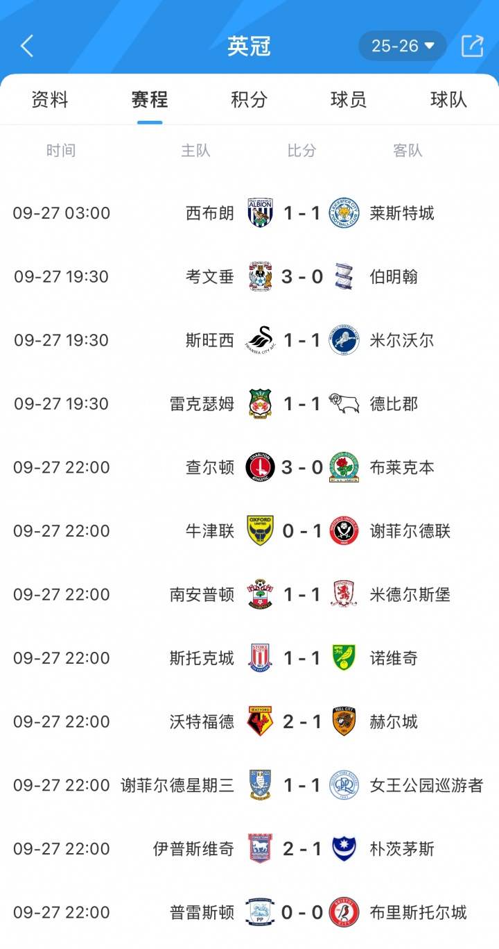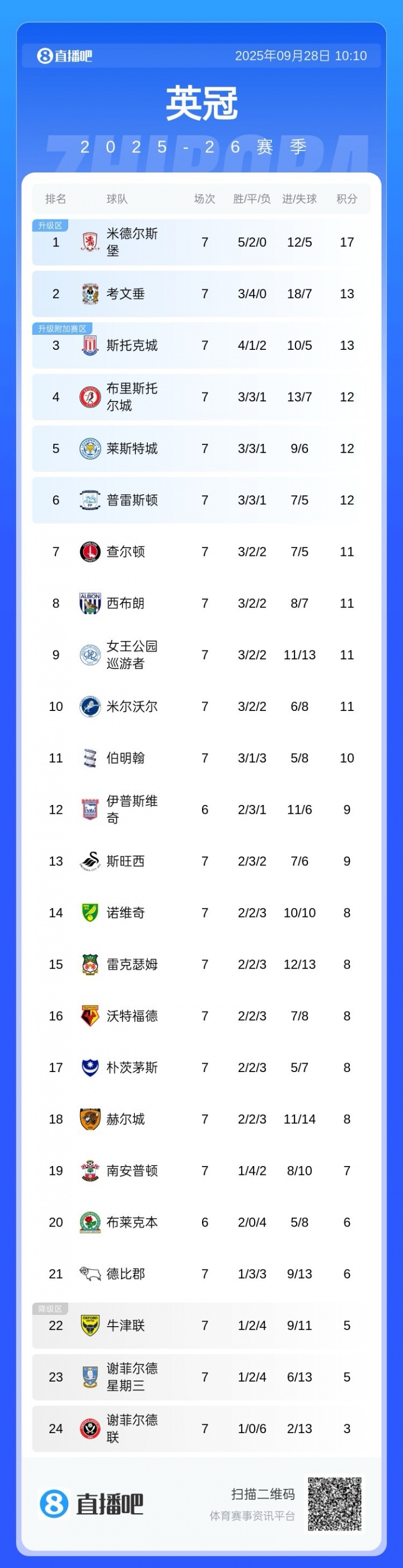 09月28日讯 英冠昨日第七轮比赛全部结束。