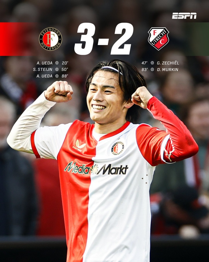 荷甲射手王!上田绮世双响+绝杀助费耶诺德登顶,8轮荷甲进8球