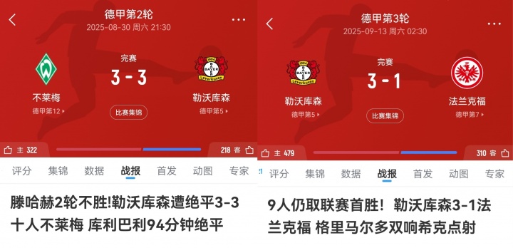 10月06日讯 勒沃库森2-0柏林联合,近4轮3胜1平,球队在开局1平1负解雇主帅滕哈赫后,目前已经来到了德甲第五的位置。