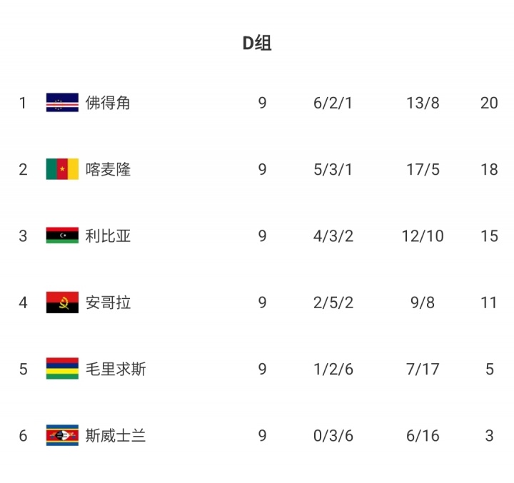 世预赛仅剩最后一轮,佛得角仍2分领跑,下轮面对小组垫底的斯威士兰,赢球即可确保队史首次晋级世界杯;喀麦隆第2落后2分,但握有7个净胜球优势。
