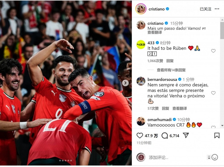 击败爱尔兰!C罗社媒晒照庆祝胜利:又迈出一步,加油!