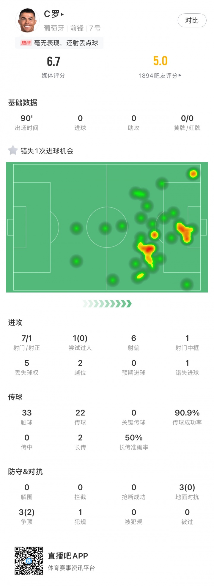 本场比赛,40岁C罗首发打满全场,7次射门6次射偏(1次中框),仅点球射正但失点。此外,C罗2次越位,5次丢失球权,1次尝试过人失败,3次地面对抗全失败。