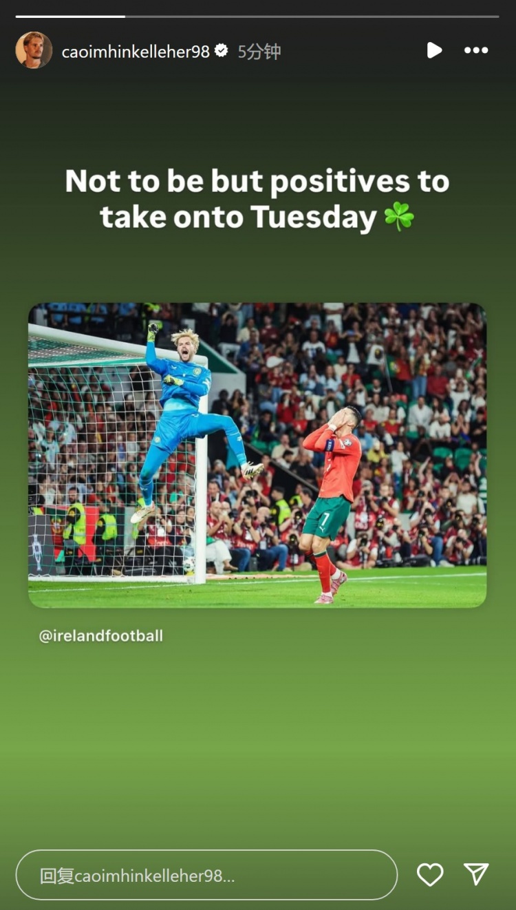 爱尔兰门将凯莱赫社媒晒扑出C罗点球后庆祝的照片,配文:“虽然未能如愿,但仍有积极因素可以带到周二的比赛之中(对阵亚美尼亚)。”